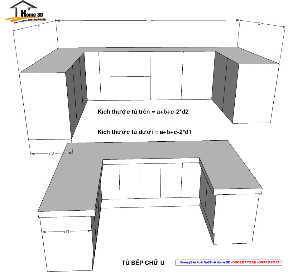 Kích thước mẫu Tủ bếp dáng Chữ U được tính theo tổng kích thước chiều dài 3 cạnh và trừ đi 2 lần chiều sâu của Tủ do phần giao nhau tại góc Tủ. Lặp lại với cách tính của Tủ bếp Chữ I và Tủ bếp chữ L nhé, bếp trên và dưới vẫn phải tính riêng để có được kết quả chính xác nhất.