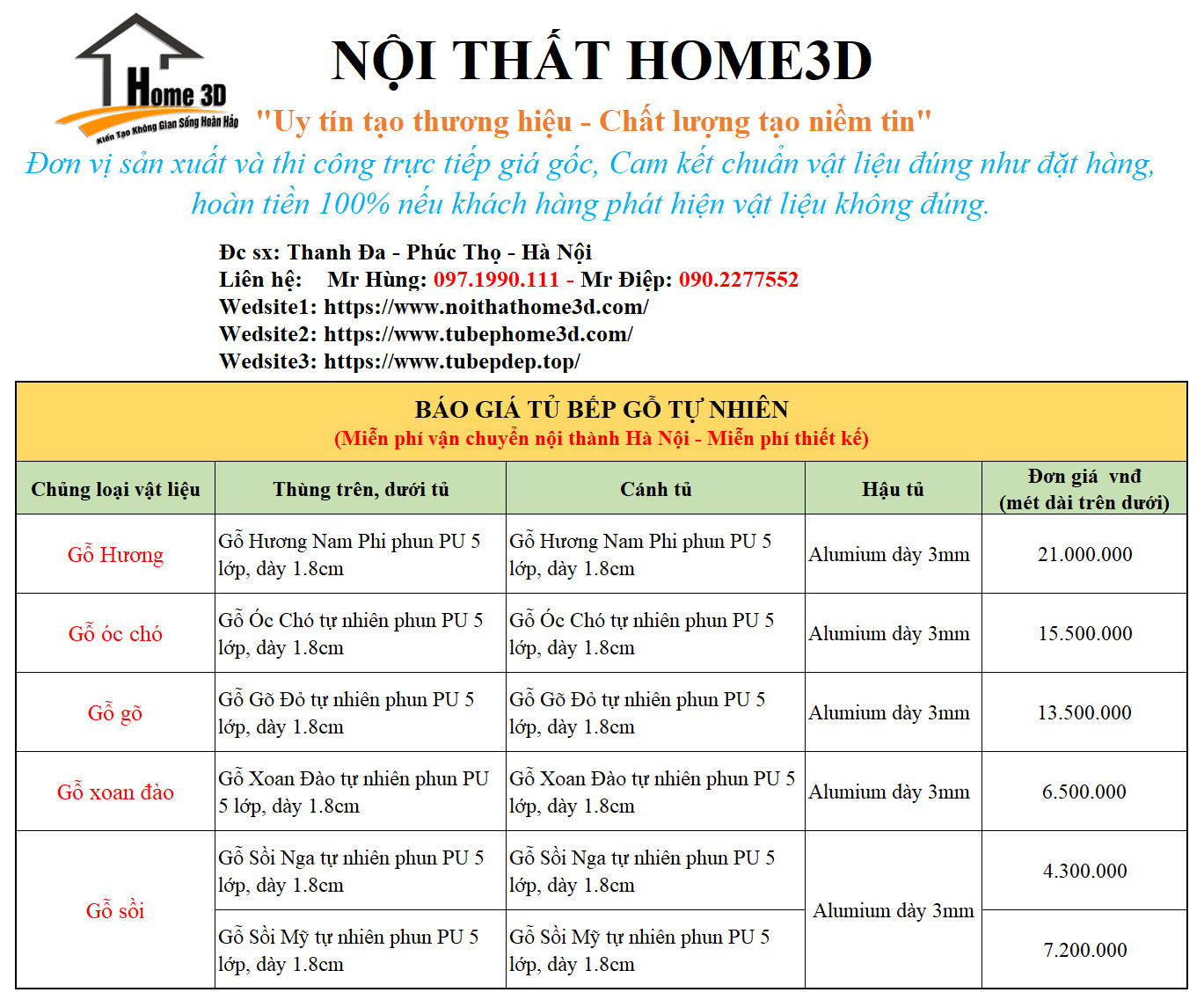 Quý khách vui lòng lựa chọn chất liệu Gỗ phù hợp với gia đình. Nội dung trên chỉ là ví dụ để quý khách có thể hình dung được cách tính giá sản phẩm của chúng tôi. Tủ bếp của gia đình bạn có thể sẽ có kích thước và sẽ thay đổi theo ý tưởng cá nhân của mỗi gia đình. Hãy gọi ngay cho chúng tôi qua hotline 097.1990.111 - 090.2277.552 để được tư vấn. Xin chân thành cảm ơn, Trân trọng.