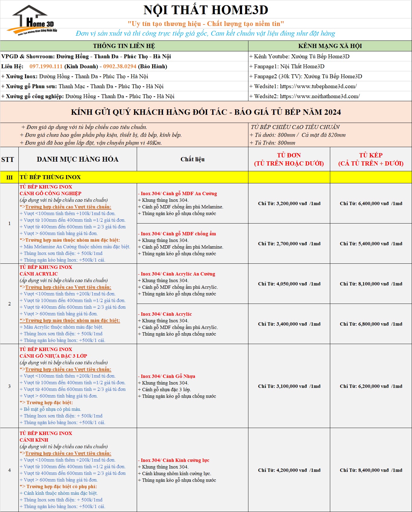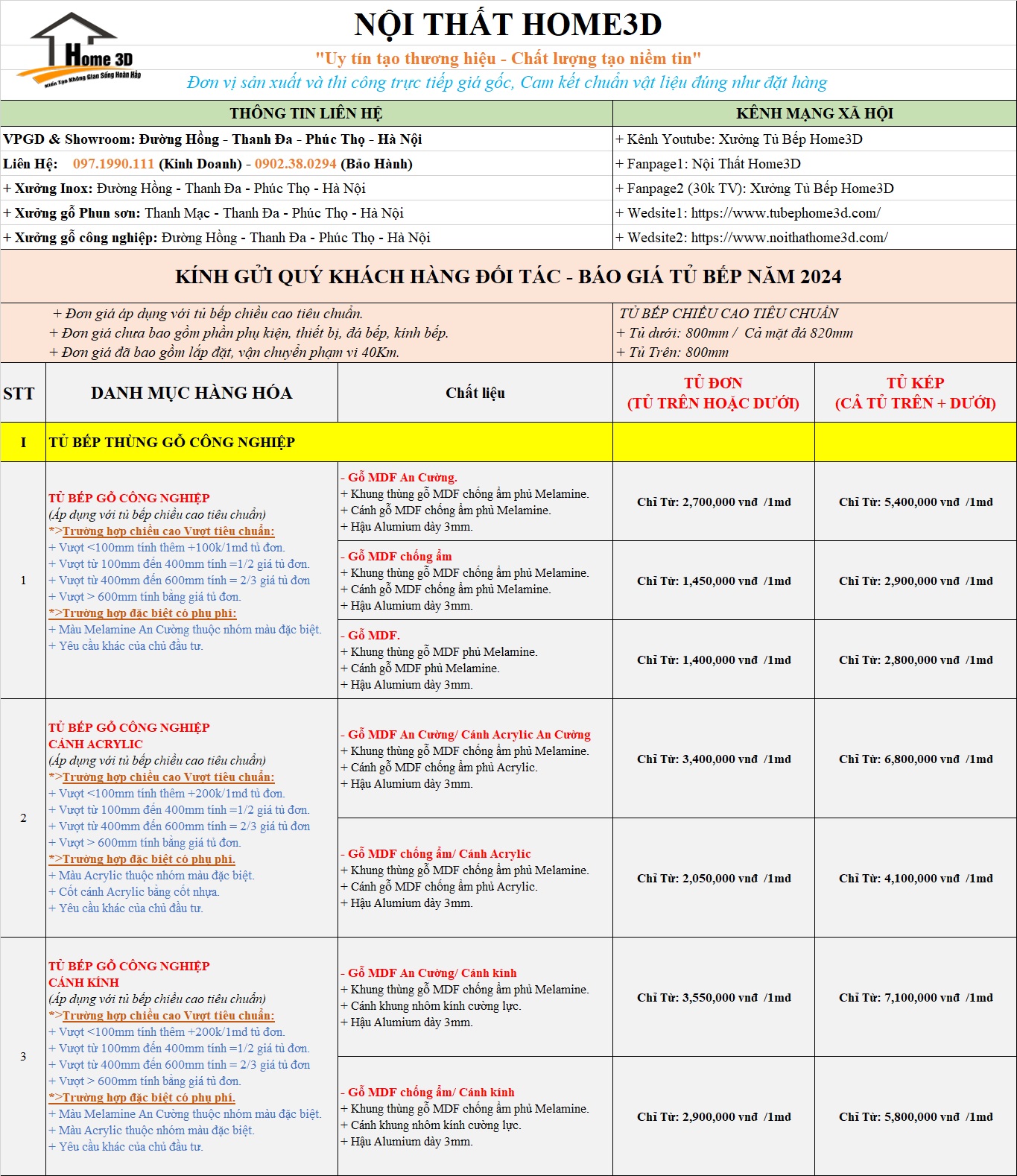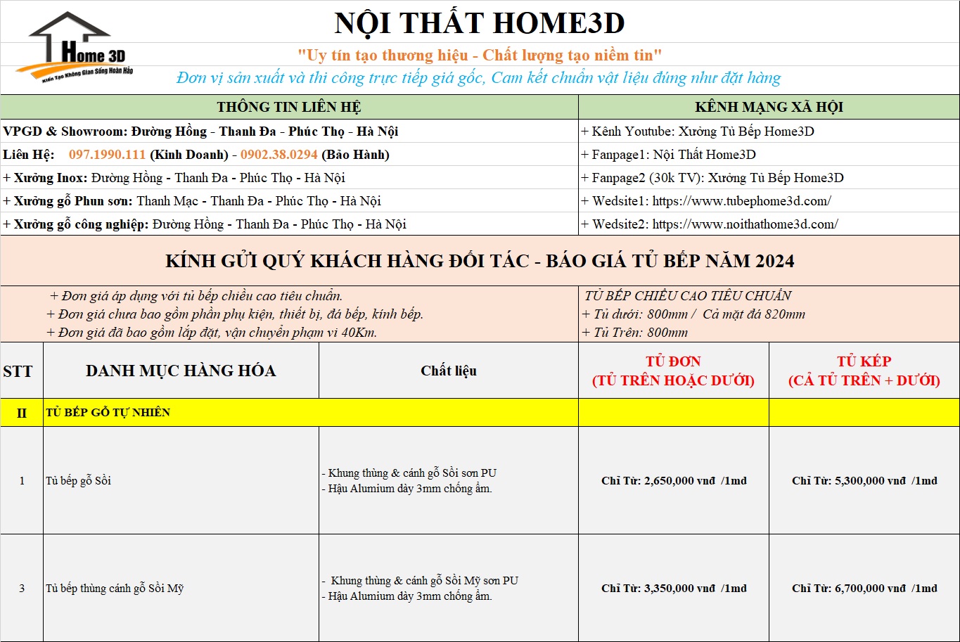 Xưởng Sản Xuất Nội Thất Home 3D Gửi Tới Quý Khách Hàng Báo Giá Tủ Bếp Mới Nhất , Phụ Kiện Cách Tính Chi Phí Các Loại Tủ Bếp Đơn Giản Nhất .