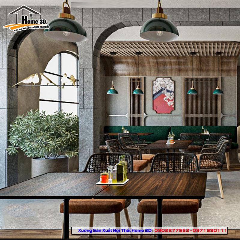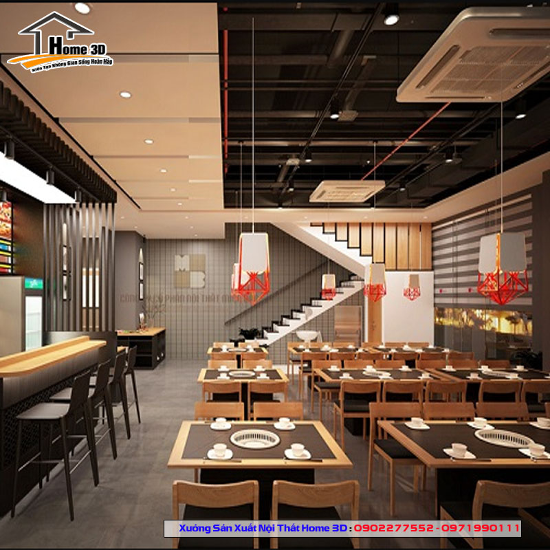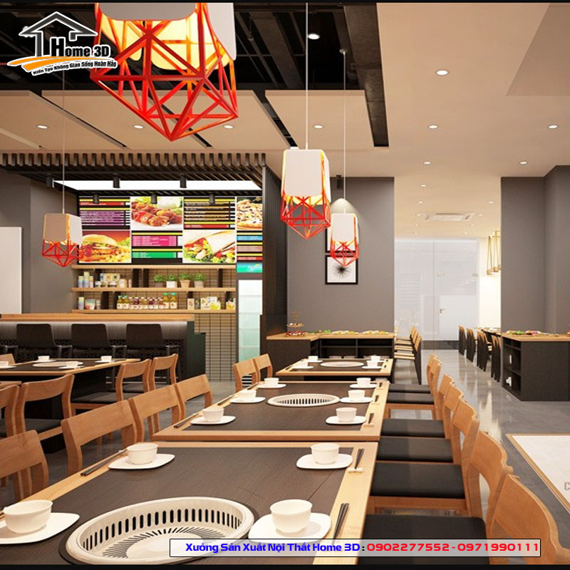 - Chất liệu cao cấp: Home 3D sử dụng các loại vật liệu cao cấp, an toàn cho sức khỏe, đảm bảo độ bền đẹp và tính thẩm mỹ cho không gian nhà hàng.