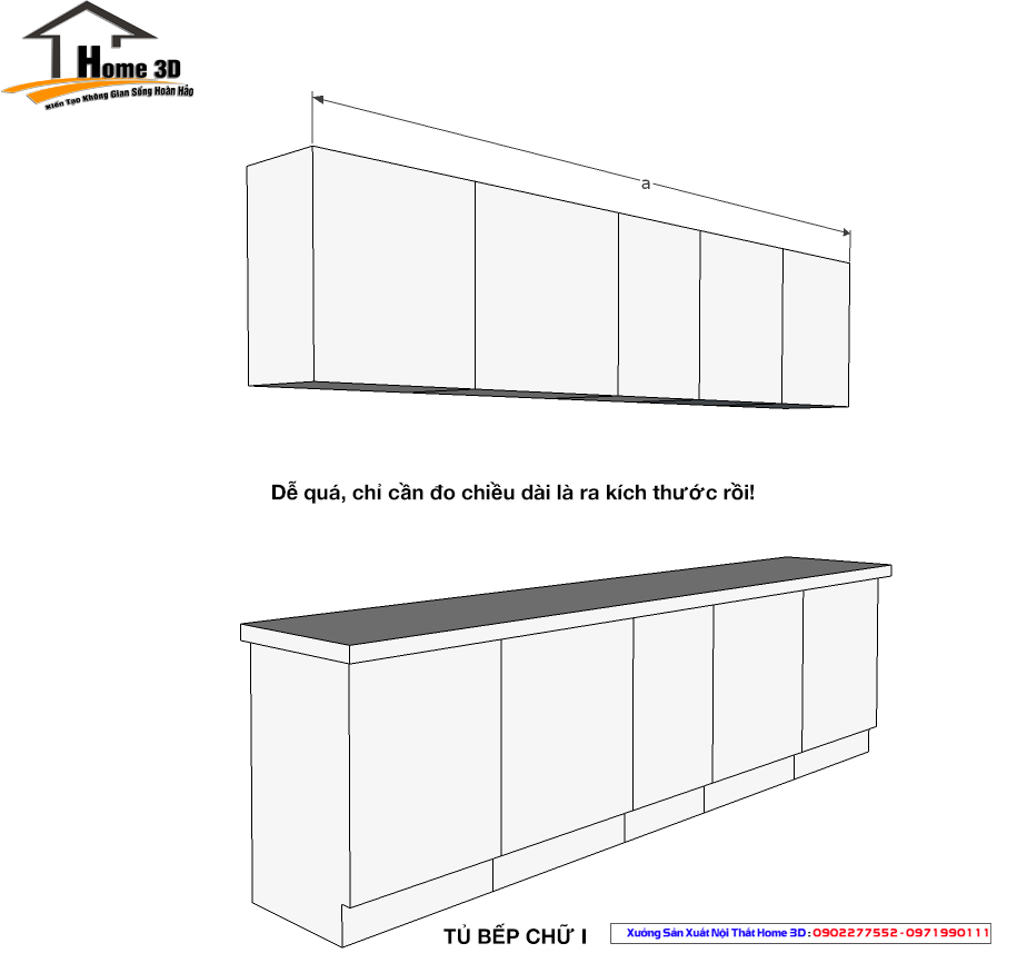 Tủ bếp chữ I là mẫu tủ bếp dễ tính nhất trong 3 mẫu Tủ Bếp, bạn chỉ cần đo chiều dài của tủ là đã có kích thước tủ rồi nhé. Có thể ở vài vị trí nhà bạn tủ bếp có kích thước trên và dưới khác nhau nên bạn hãy tính bếp trên, bếp dưới riêng để có kích thước và báo giá chính xác nhé.