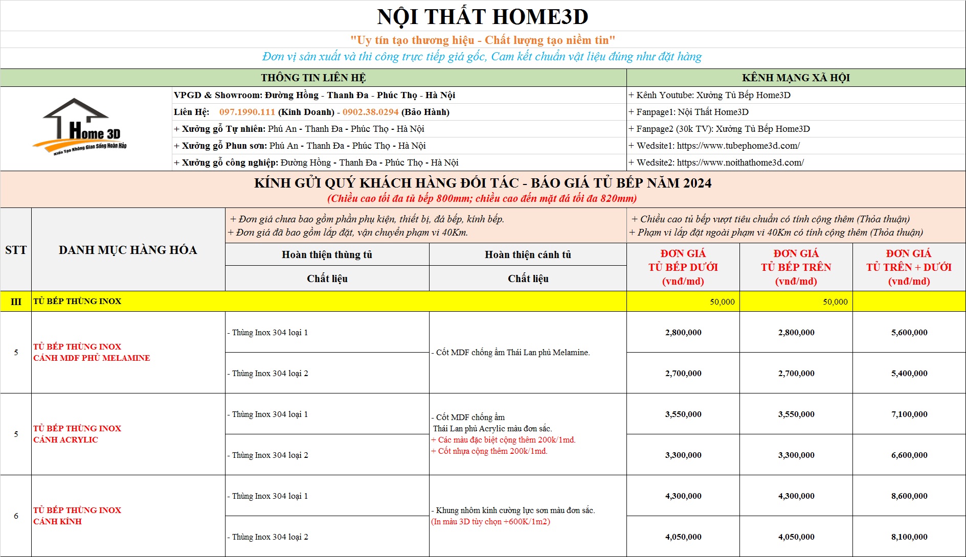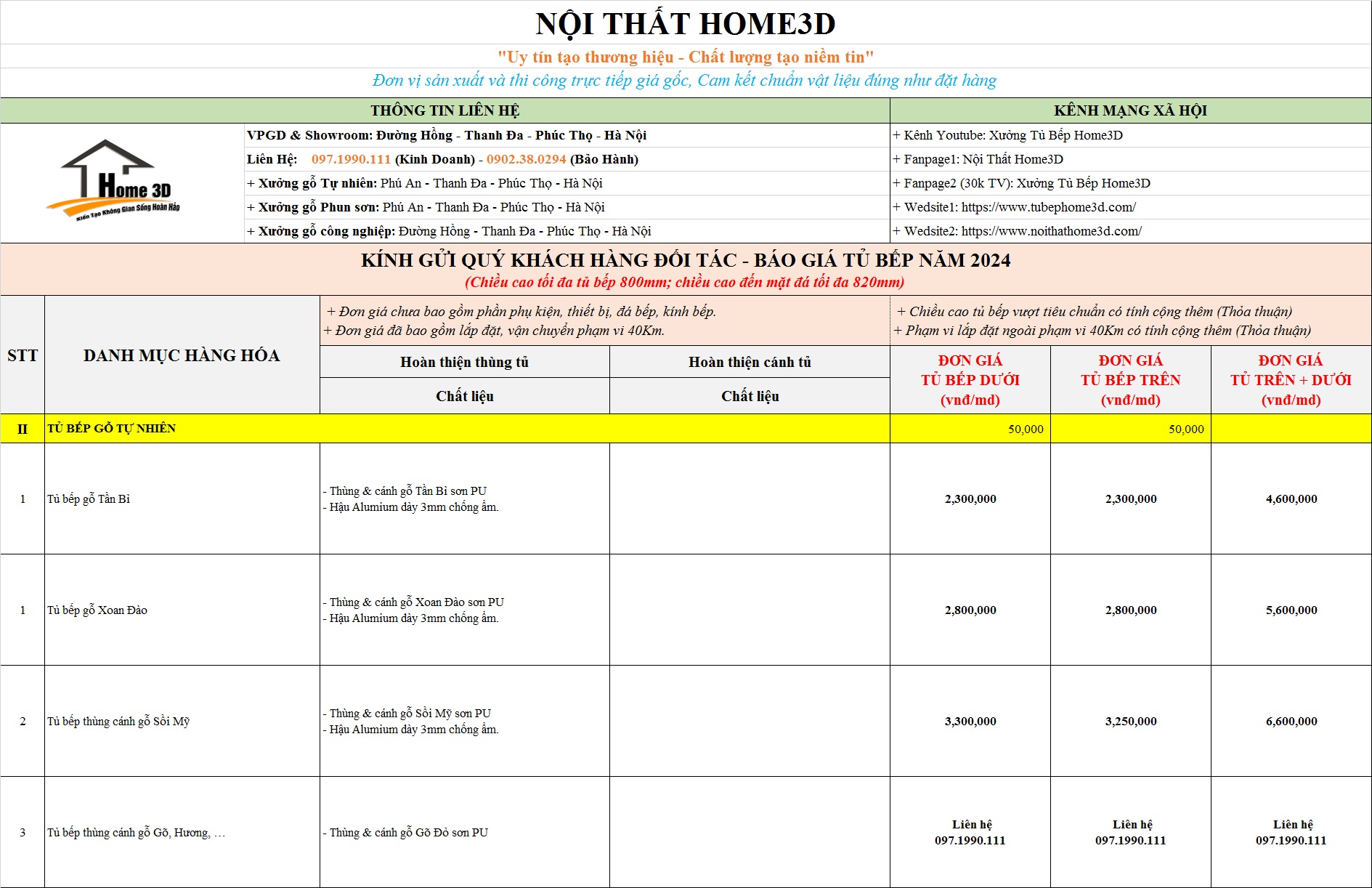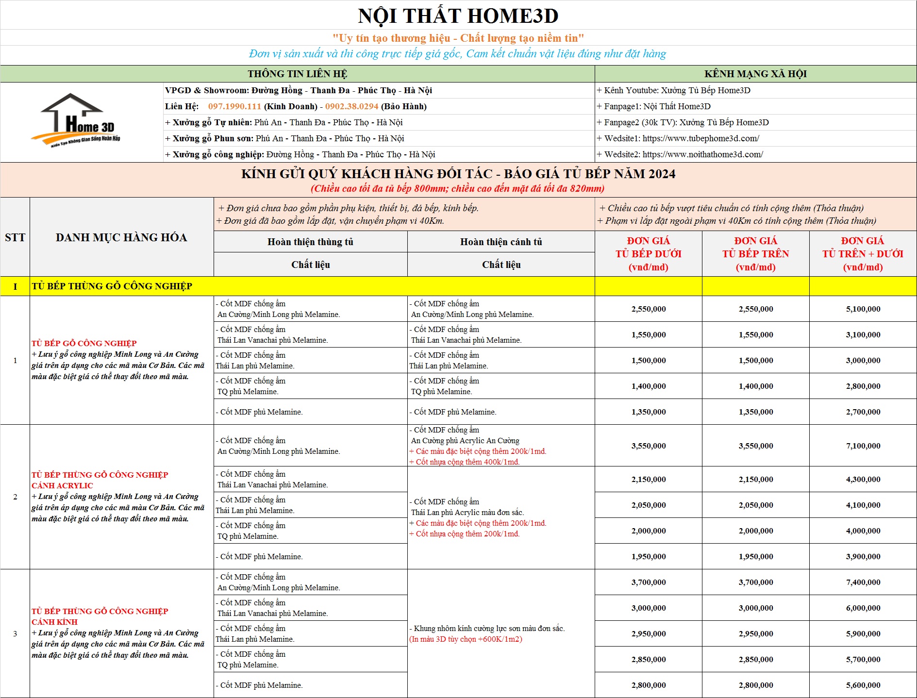 Xưởng Sản Xuất Nội Thất Home 3D Gửi Tới Quý Khách Hàng Báo Giá Tủ Bếp Mới Nhất , Phụ Kiện Cách Tính Chi Phí Các Loại Tủ Bếp Đơn Giản Nhất .