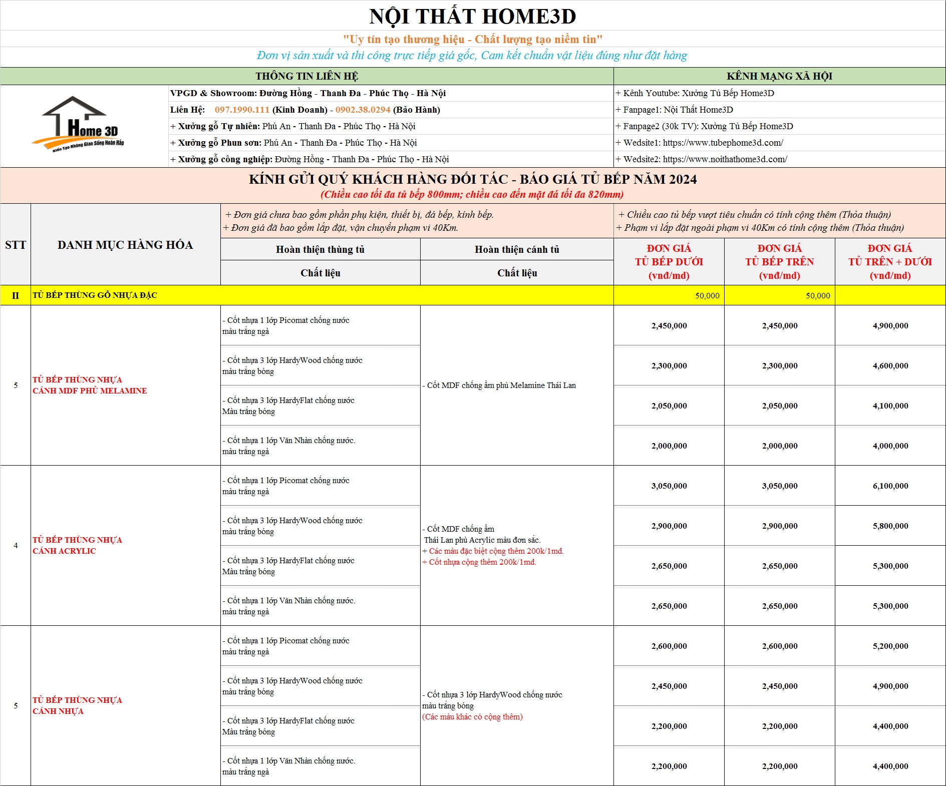 2. Báo Giá Chi Tiết Tủ bếp thùng gỗ nhựa: