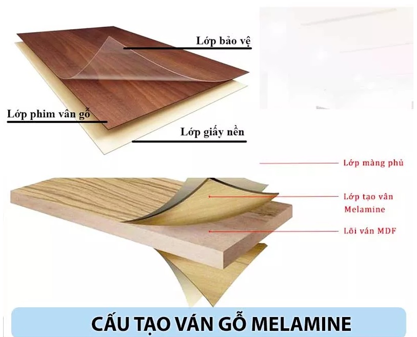 – Melamine là chất liệu trang trí bề mặt gỗ, chúng được cấu tạo gồm 3 lớp chính: