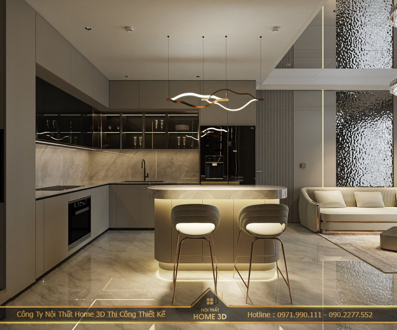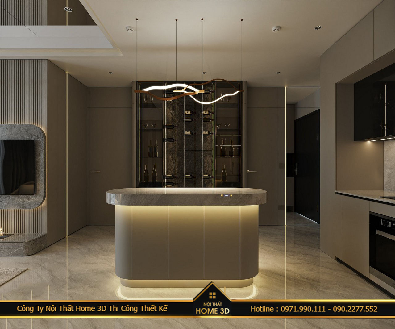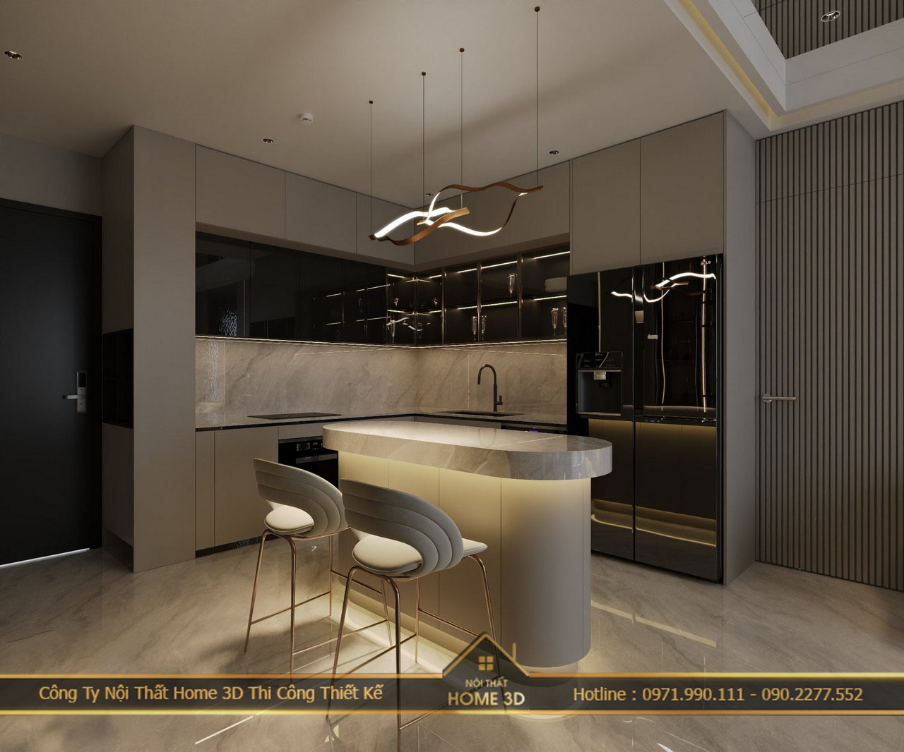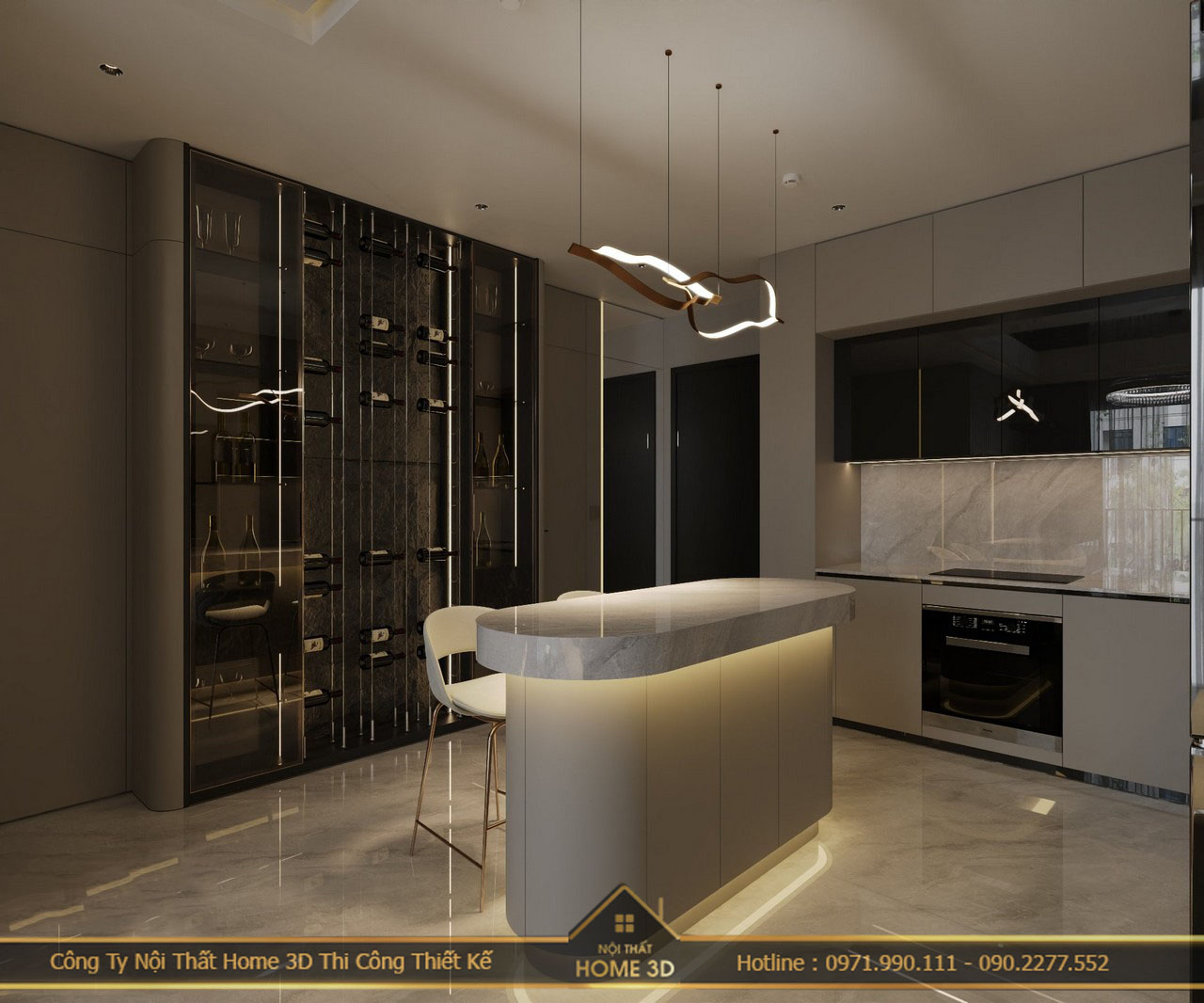 • Bàn đảo đa năng: Bàn đảo kết hợp quầy bar, tạo thêm không gian tiếp khách và thưởng thức đồ uống.