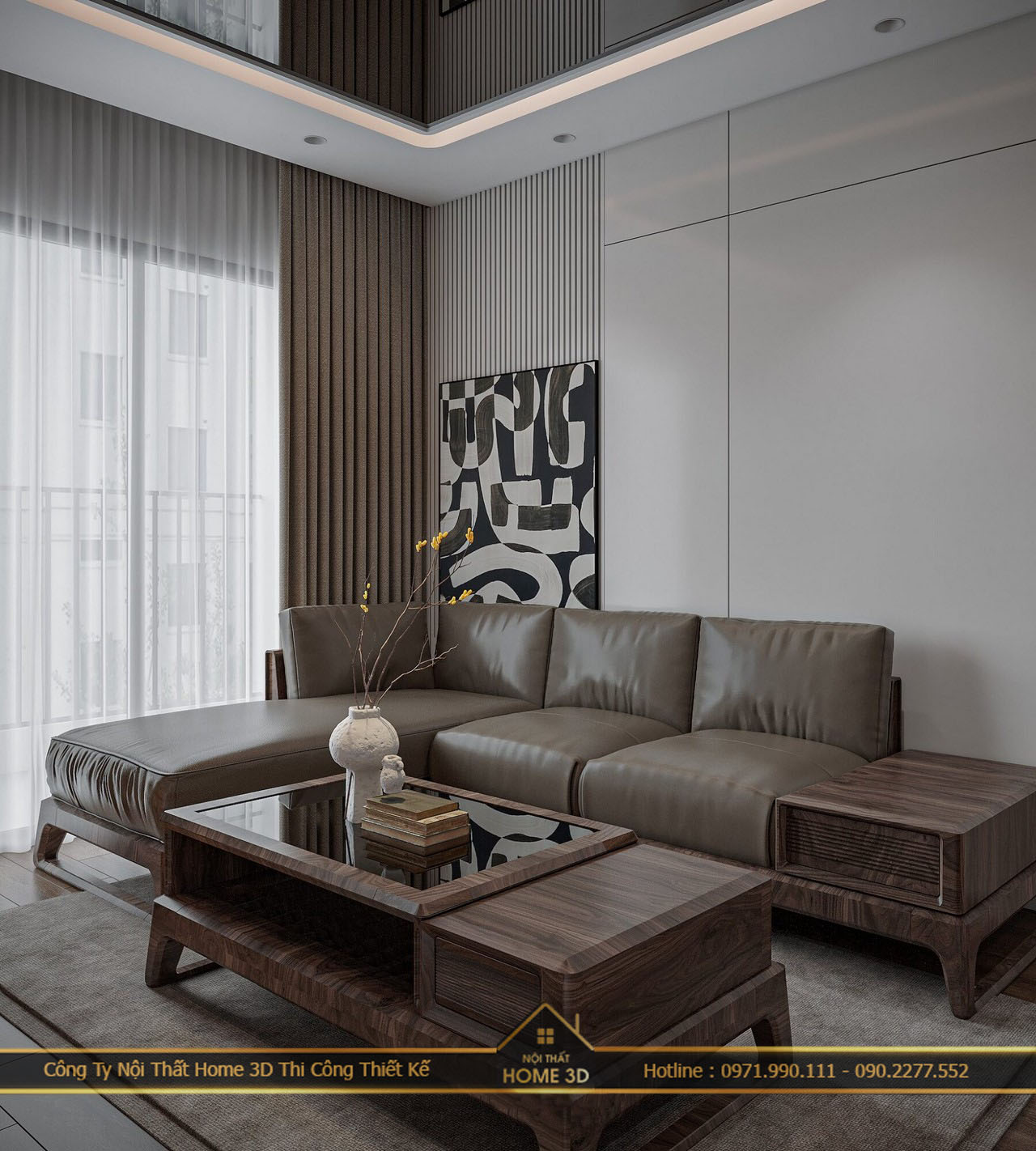 • Bố trí nội thất thông minh: Sử dụng sofa góc, kệ tivi treo tường, giúp tiết kiệm diện tích tối đa.