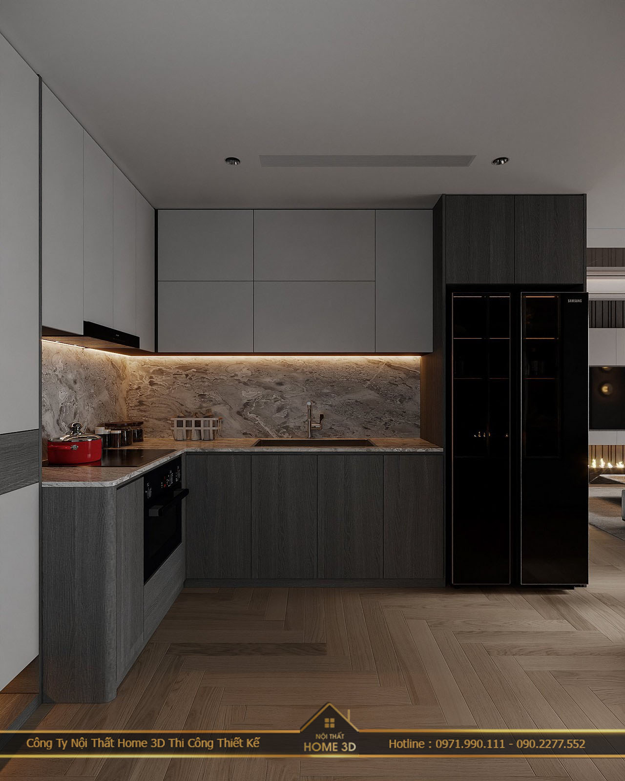 - Tối ưu công năng: Sử dụng tủ bếp âm tường, bếp từ, hút mùi, máy rửa chén, giúp việc nấu nướng trở nên dễ dàng, tiện lợi hơn.